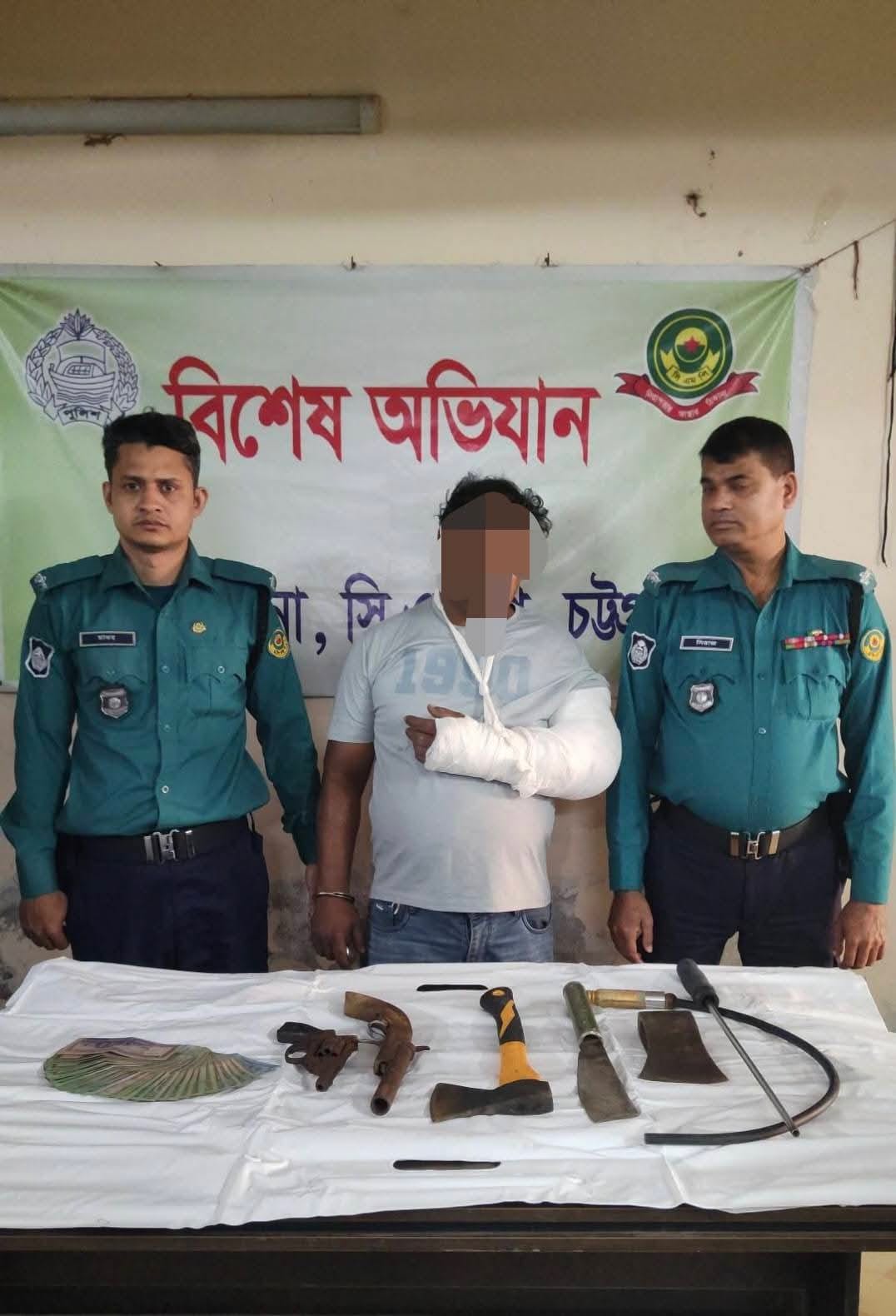 গ্রেপ্তারের সময় তার কাছ থেকে একটি দেশীয় তৈরি এলজি, একটি পুরোনো বিদেশি রিভলভার, দুটি চাইনিজ কুড়াল, একটি ধামা, একটি প্লাস্টিকের হাতলযুক্ত স্টিক, একটি প্লাস্টিকের হাতলযুক্ত চাবুক এবং নগদ ১৮ হাজার ৯৫০ টাকা উদ্ধার করা হয়।
