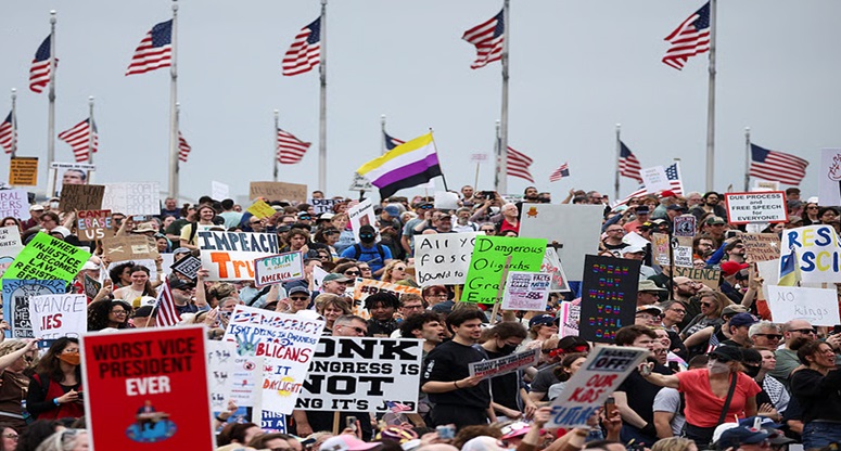 বিএনএ, বিশ্বডেস্ক : ট্রাম্পকে ক্ষমতা থেকে সরানোর দাবিতে যুক্তরাষ্ট্রের ৫০টি অঙ্গরাজ্যে একযোগে শুরু হয়েছে ‘নো কিংস’ আন্দোলন। রাজপথ কাঁপানো এই বিক্ষোভে শামিল হয়েছেন প্রায় ৮০ লাখ মানুষ, যাদের সবার লক্ষ্য একটাই—‘ট্রাম্প হঠাও’।