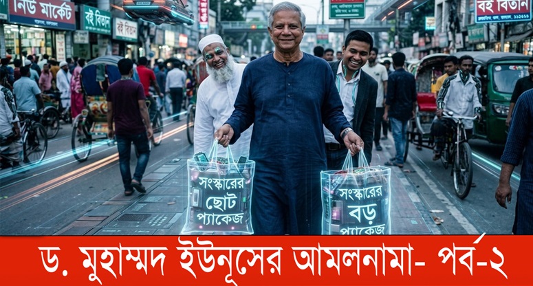 প্রসঙ্গত, ড.মুহাম্মদ ইউনূস গ্রামীন মোবাইল ফোনের প্রতিষ্ঠাতা। তার হাত ধরে দেশে মোবাইল ফোনের বাজার সম্প্রসারিত হয়। মোবাইল অপারেটররা যেমন ছোট-বড় বিভিন্ন ডাটা বা টকটাইম প্যাকেজ দিয়ে গ্রাহককে প্রলুব্ধ করে, ড. ইউনূসও তেমনি রাষ্ট্র সংস্কারের ১০টি কমিশন গঠন করে জাতিকে একটি ‘অন্তহীন প্যাকেজে’র মধ্যে ঢুকিয়ে দিয়েছিলেন। ড. ইউনূস নির্বাচনের একটি সুনির্দিষ্ট রোডম্যাপ না দিয়ে বারবার সংস্কারের ‘ছোট প্যাকেজ’ ও ‘বড় প্যাকেজ’-এর তত্ত্ব সামনে এনেছে। ‘রাষ্ট্র মেরামত’ বা ‘বৈষম্য দূরীকরণ’-এর মতো সুন্দর নাম দিয়ে বড় বড় প্রতিশ্রুতি দেওয়া হয়। সংস্কারের পরিধি নিয়ে বারবার অবস্থান পরিবর্তন করা হয়েছে।